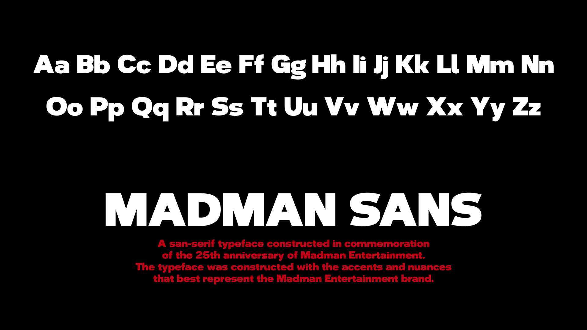 To commemorate the 25th year anniversary of Madman Entertainment, a new adaption of the Madman Entertainment logo was implemented to celebration its inception in 1996. My role was to design the new logo and to review some of the branding elements, notably the creation of a custom typeface that draws influence from Madman Entertainments iconic logo and brand.