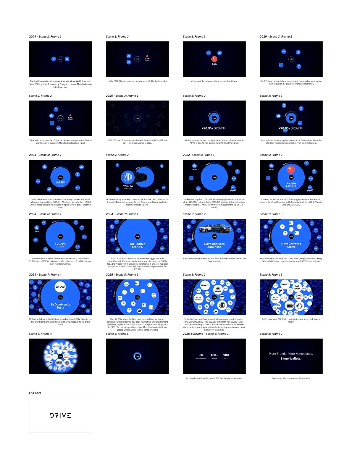 This motion graphics piece was developed for Drive.com.au to illustrate the growing presence of Chinese car brands in the Australian automotive market. The infographic was carefully constructed through a detailed storyboarding process, allowing the visual flow and data presentation to align seamlessly with the narrative.